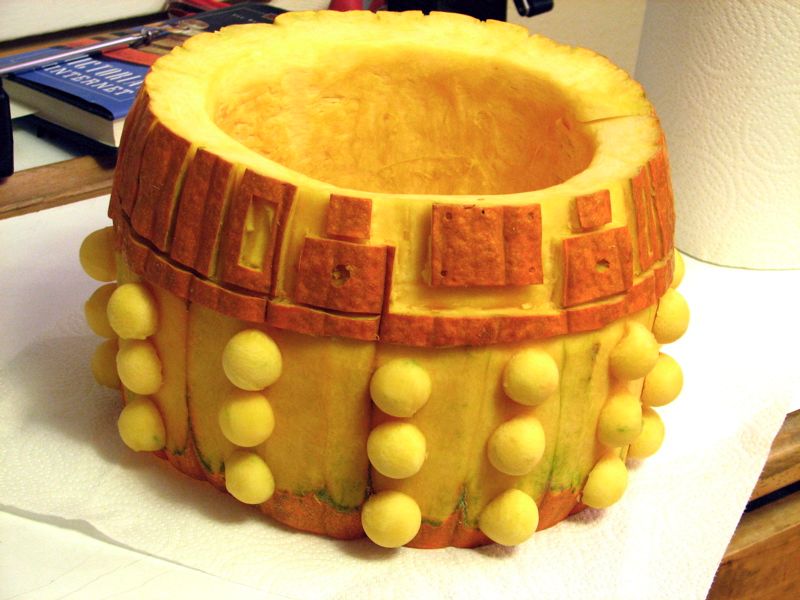 Final touches: The “eye” and two “ears” are pieces of carrot. Instead of the toilet plunger and paint rollers that the originals had, I used a hand-mixer beater paddle and a candy thermometer. I think that they both work pretty well. Overall, however, the shape is almost too round to be recognized as a Dalek. But, we are somewhat constrained by the shape of the pumpkin. With a bit of work, you could make a pretty good R2D2 by the same method. I hope someone else does that because I’m not planning to. =)