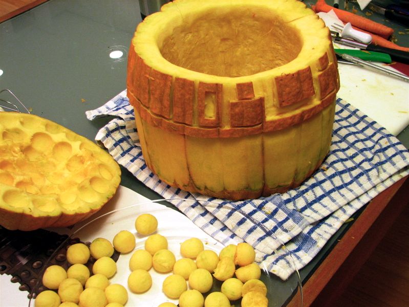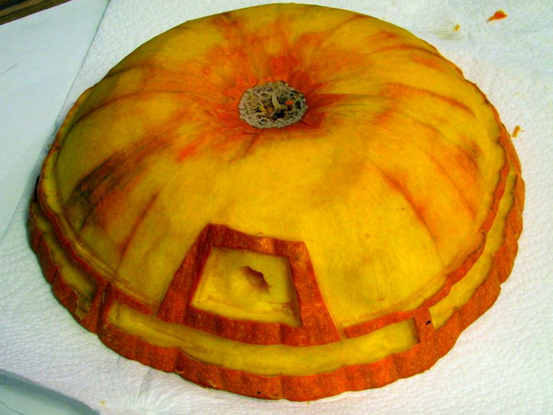 Because of the shape of the pumpkin, we decided to carve it upside down. The “head” of the Dalek that you see here is actually the bottom of the pumpkin. We took the “lid” of the pumpkin, which has the stem, and cut it up like crazy with a melon baller, as you can see on the right.