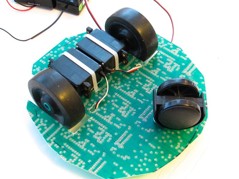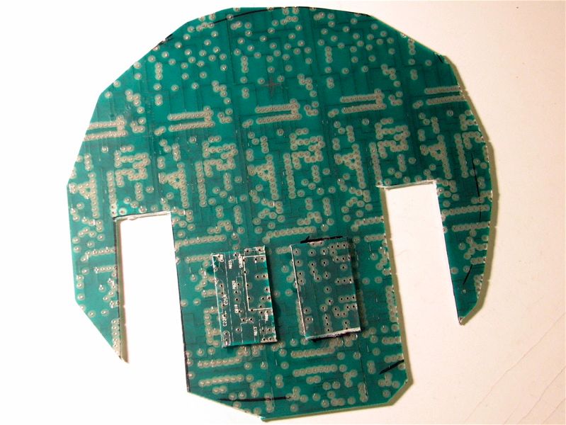 For the platform, I took a large and blank printed circuit board and cut it to shape. (Big tinsnips work quite well for this; hardly anything else short of a hydraulic shear works at all.) I drilled a couple of extra holes for wiring and for cable ties to hold the servo motors in place.