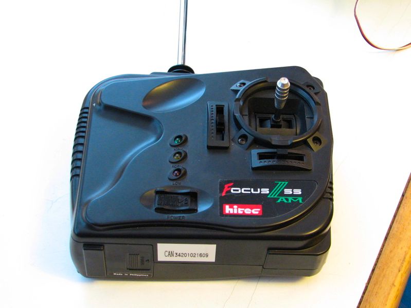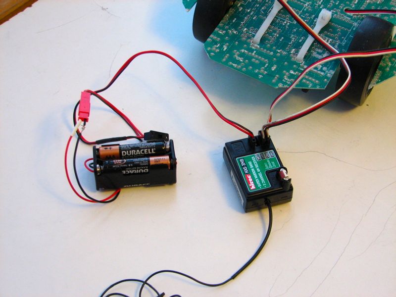 Here is the radio system. It’s a Hitec Focus III single-stick system. It has a third control channel on the back (not visible). One of the nice features that it has is servo mixing, intended for use in certain types of model airplanes. Servo mixing changes the thrust and steering mode from that of a radio-control car (one motor controls thrust, one controls direction) to that of a radio-control tank, where both motors are involved in thust and steering control. (With servo mixing enabled, the left-right and up-down controls are summed and differenced such that pushing the stick in the “up” direction causes both servos to move in opposite direction, pushing the robot forward. Similarly, pushing the control stick left or right causes the robot to turn. The third channel of the radio control system is not affected by the mixing option.)