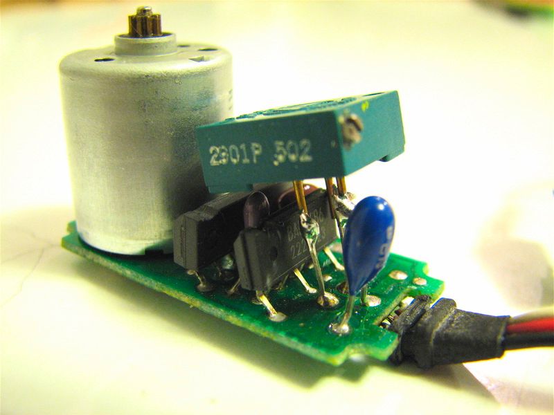 We need a total of three motors; two drive motors and one to rotate the head. For each of these applications, I used a standard servo motor, modified for continuous rotation according to these instructions. The instructions suggest replacing the pot in the servo motor with a pair of fixed resistors. While I believe that that is (in principle) the best way to go, I was unable to make it work in several tries– probably just due to the poor tolerance on my resistors. So, I replaced the original 5k pots with minature trimpots like the one shown here. This is quite nice because you can easily trim the zero-point of your servo motor.