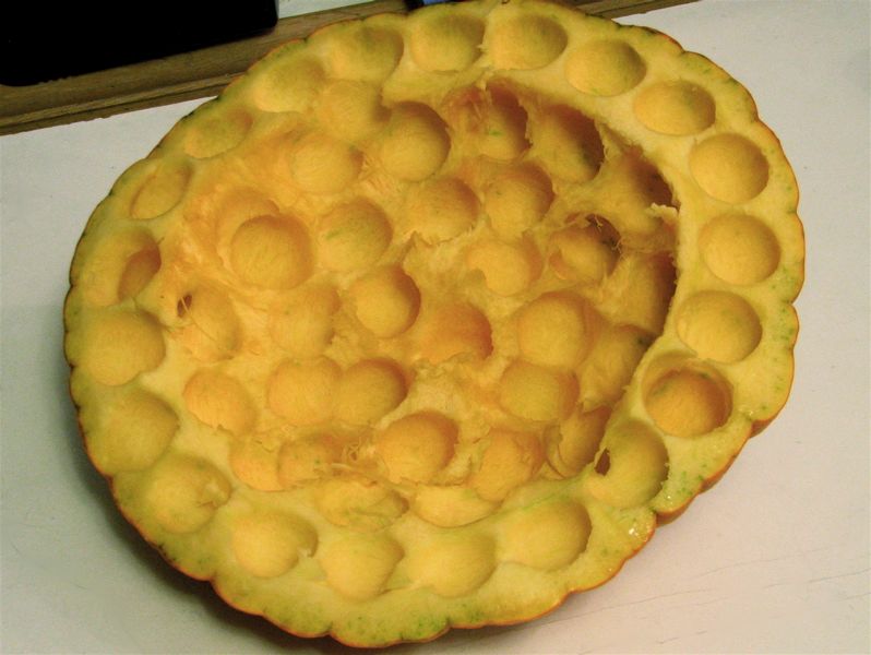 Here is the most time-consuming stage of the build: Carving the pumpkin. I cut fourteen flat faces into the lower sides of the pumpkin. In doing so, I removed much more material from the pumpkin than I did during the stage of removing the seeds!After getting the shape correct, the punpkin balls (well, hemispheres) were attached with toothpicks.
