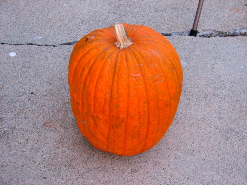 Here’s the victim, a standard size grocery-store pumpkin with a nice thick mottled skin. You might also see that it tapers down slightly; it’s slightly wider at the top than the bottom.