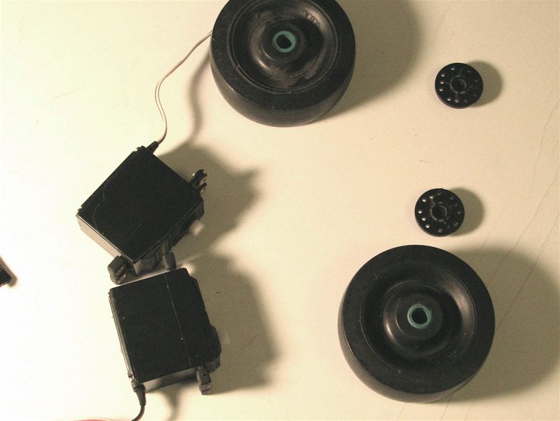 I went to a local junk shop and picked up two heavy rubber wheels, which will be the drive wheels. The wheels will mount to a couple of standard servo motors, shown for scale. I also picked up a cheap office-chair caster, which will be the third wheel.