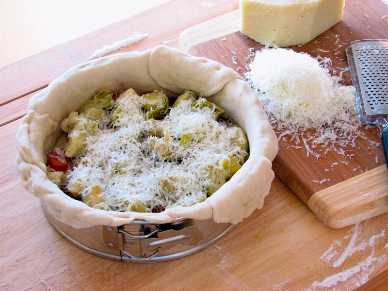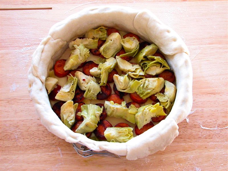 Now it’s time to get creative and add your fillings. For a more traditional pizza, you might want to put in a layer of italian sausage or spinach, but we’re rather prone to culinary experimentation. We stuffed these particular pizzas with chicken andouille sausage and marinated artichoke hearts. (Is that combination good? Oh-my-god, yes.)