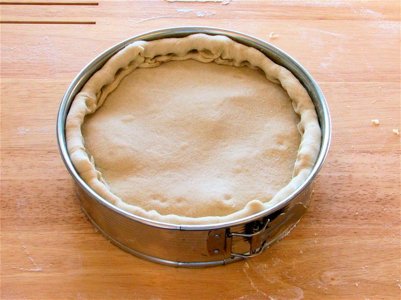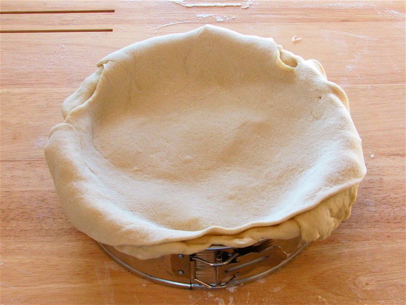 To begin the actual assembly, drape the large circle of dough over the springform pan.