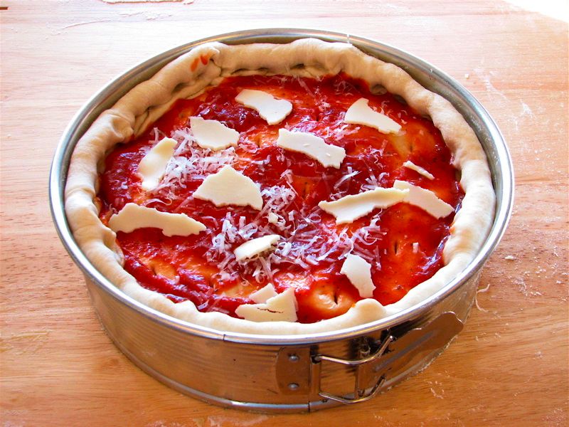 Patch the edges of the crust, as needed, to make sure that the crust extends up high enough.You can now begin filling the pizza. We like to start with a thin layer of grated or sliced provolone on the bottom.>