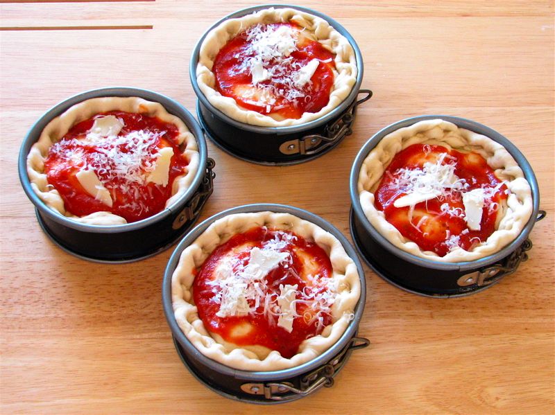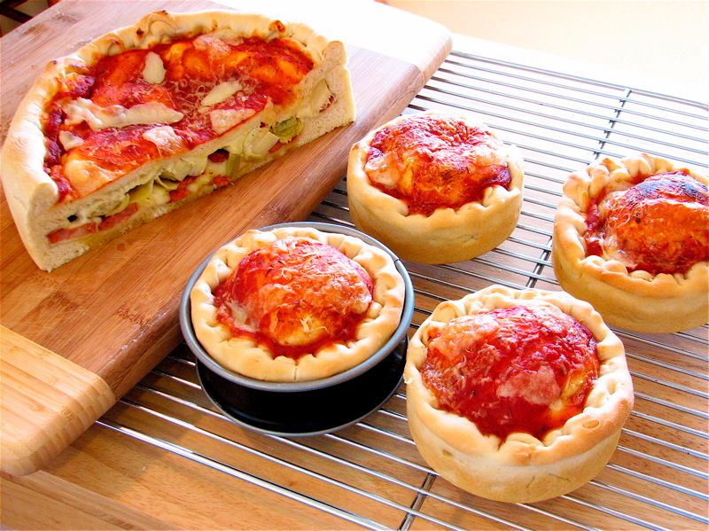 Stuffed pizzas are a Chicagoan delicacy consisting of layers of cheese and fillings above– and below– a thin pizza crust. One of the best ways to bake them is in a springform pan, so that the sides come out in perfect cylinders and come out easily. Taken to the small extreme, individual-sized stuffed pizzas are the ideal portable food to take to work for lunch. Made in miniature springform pans, they are compact, cute, tasty, filling, and are almost guaranteed to make your co-workers jealous. Read on and we’ll show you how to make your own springform stuffed pizza, in any size you like.
