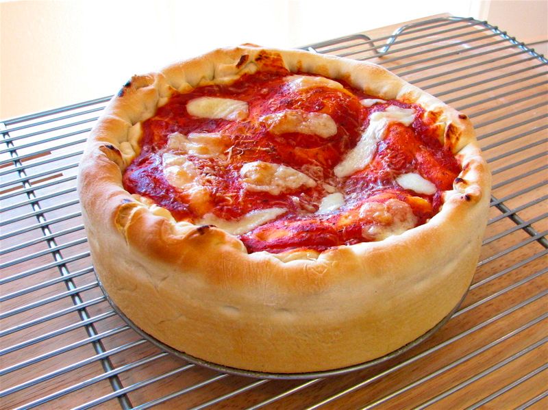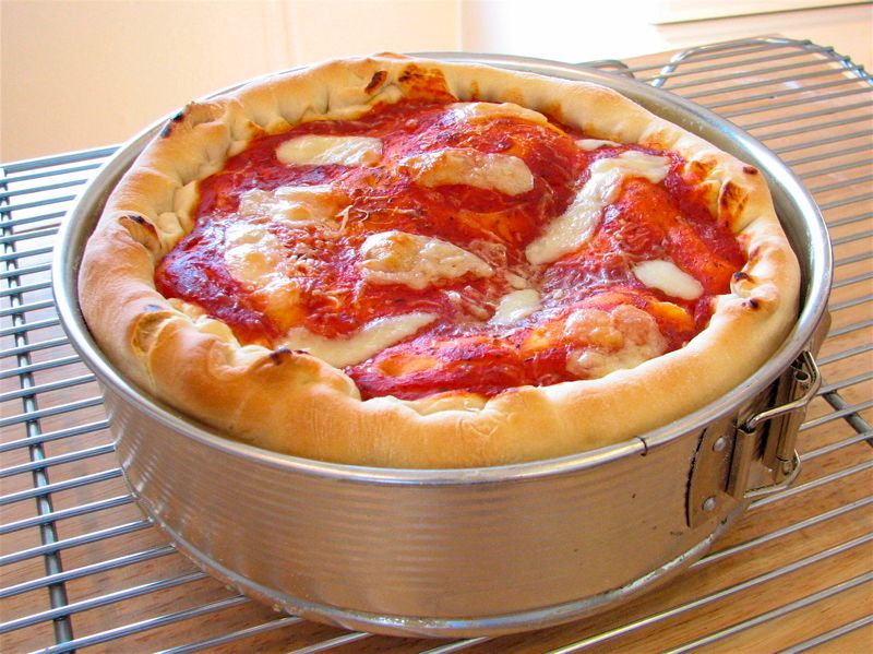 With true cylindrical sides, it’s a trick to get the pizza out in once piece, and with the angled sides, well, you’ll never have a properly shaped stuffed pizza.Slightly better than a deep-dish pizza pan is the old standby: a large, well-seasoned, cast iron skillet. We used to make all of our stuffed pizzas this way, and it actually works fairly well: the sides of the pan are sloped just enough that you have some hope of getting it out, but not so much that the result no longer resembles stuffed pizza. Unfortunately, this was still not a perfect solution because the bottom of the pizza has a tendency to stick to the bottom of the skillet, making it difficult to impossible to remove. (And if you don’t take the pizza out of the pan, you have the weeping lasagna problem. Later, the leftovers ooze when reheated.)