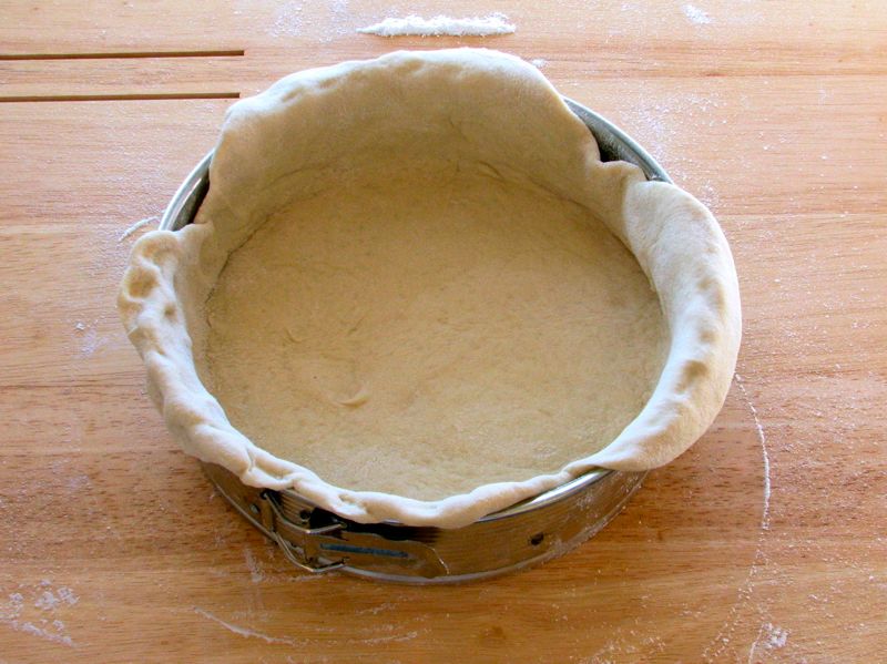 You can use your favorite dough recipe, but if you need one to start with, try this one. (Note that we haven’t yet tried the accompanying filling recipe – we usually improvise the fillings. Also note that she uses a springform!) Assume that you need one typical batch of dough for either one large or four small stuffed pizzas; we’re using a double batch for our set of five pizza.