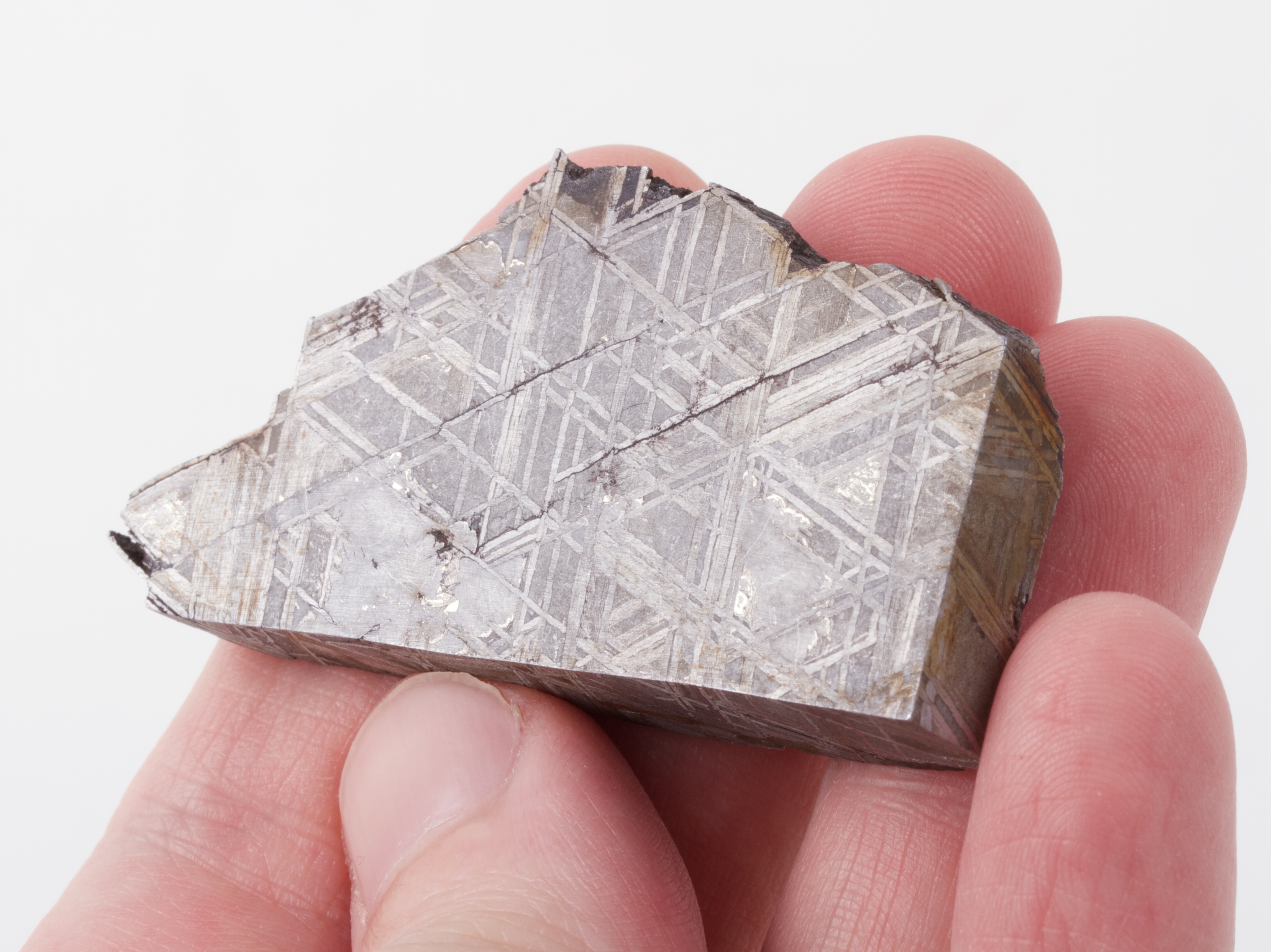 This specimen is a 68 gram sample cut from a fragment of the Muonionalusta meteorite. According to our best current understanding, the parent body that Muonionalusta came from was one of the earliest bodies to take shape during the formation of our solar system. It began as a protoplanet (or planetisimal) that accreted within the protoplanetary disk that would eventually become our solar system. It accreted over the course of roughly the first million years after the beginning or our solar system. (That is to say, during the first million years after the very first solids condensed from the protoplanetary disk.) The parent body had an iron-nickel “planetary” core, 50–110 km in radius, that was eventually exposed by collisions that stripped away most of its insulating mantle. It cooled very slowly over the next 1-2 million years. It is estimated (with startling precision) by Pb-Pb dating that the body crossed below a temperature of ~300 °C at 4565.3 ± 0.1 million years ago, just 2-3 million years after the solar system began to form. For the next four billion years, it led a largely unremarkable existence as an asteroid (minor planet) until it broke apart (possibly due to a major collision) about 400 million years ago. Then, one fine day roughly one million years ago, a large fragment entered the earth’s atmosphere, breaking into hundreds (perhaps, thousands) of smaller fragments that rained down in a shower of fire upon what is now northern Sweden and Finland. Four ice ages transported the surviving meteorite fragments across the Swedish tundra, until their first discovery (and naming after the nearby Muonio river) in 1906.