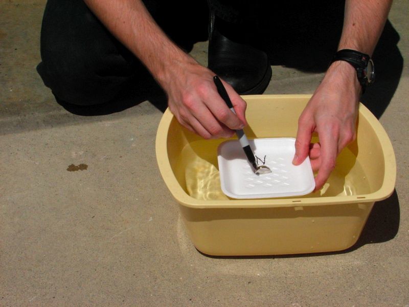 Our friends stopped by with a simple apparatus to demonstrate the diamagnetic properties of bismuth metal. Diamagnetism is a extremely weak magnetic effect — generally orders of magnitude weaker than everyday permanent magnets, which exhibit ferromagnetism. However it is also an extremely interesting effect because diamagnetic materials are repelled by magnetic fields. This is different than the case with ferromagnets, where one pole of a magnet repels another — rather, the entire material is (weakly) repelled by any magnetic pole.